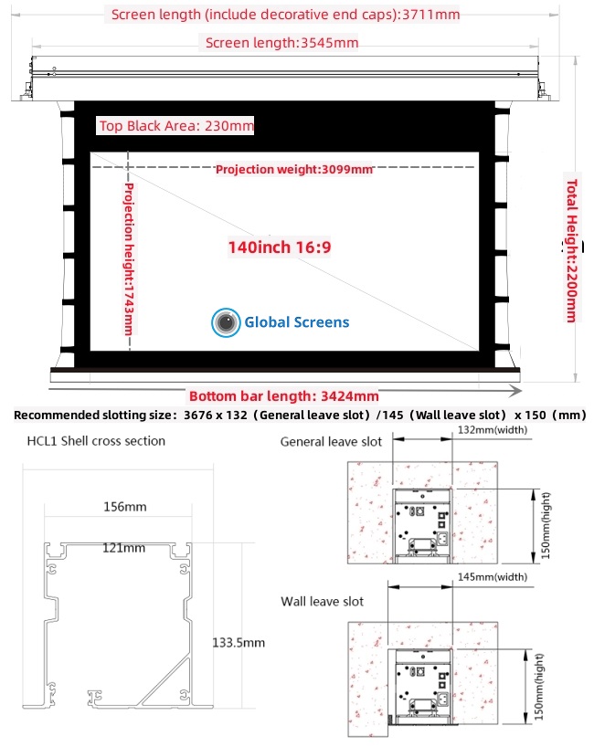 Технические характеристики Экран встраиваемый в потолок с системой натяжения Global Screens Intelligent HomeScreen ICL2-140EX 174*310 Pro 4K (extradrop 85 см)