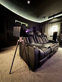 Зона просмотра очень компактная, около 10-12 кв.м., по этому максимум, что могло сюда правильно встать - это 100" экран и система 5.1 со встроенными передними LCR акустикой и тыловыми колонками в потолке