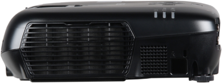 На левом боку — основная воздухозаборная решетка с заменяемым фильтрующим элементом, решетка миниатюрного динамика, разъем для кенсингтонского замка, а на стыке с днищем — ниша с перемычкой, за которую проектор можно толстым тросиком приковать к чему-нибудь основательному.
