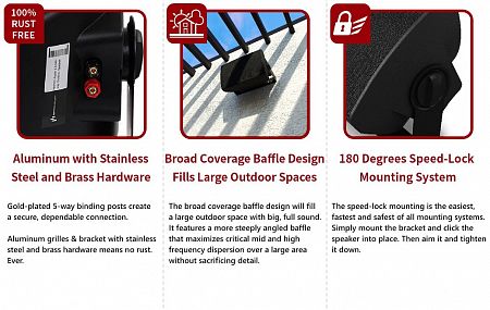 Также к особенностям всепогодных акустических систем можно отнести обязательное наличие прочных, надежных и эргономичных крепежных элементов, которые не изнашиваются при регулярном использовании. Чаще всего они выполнены в виде встроенных кронштейнов или подвесов.